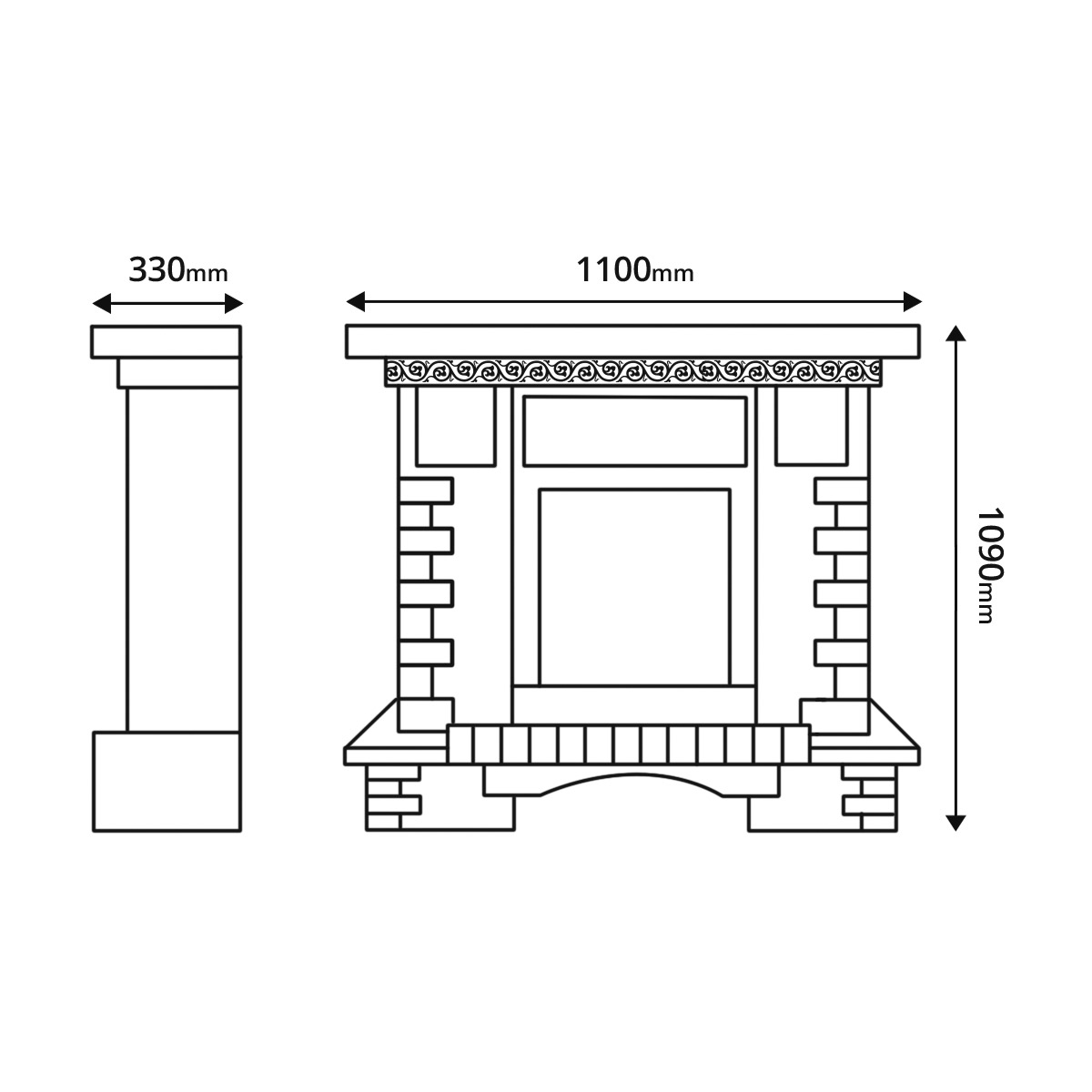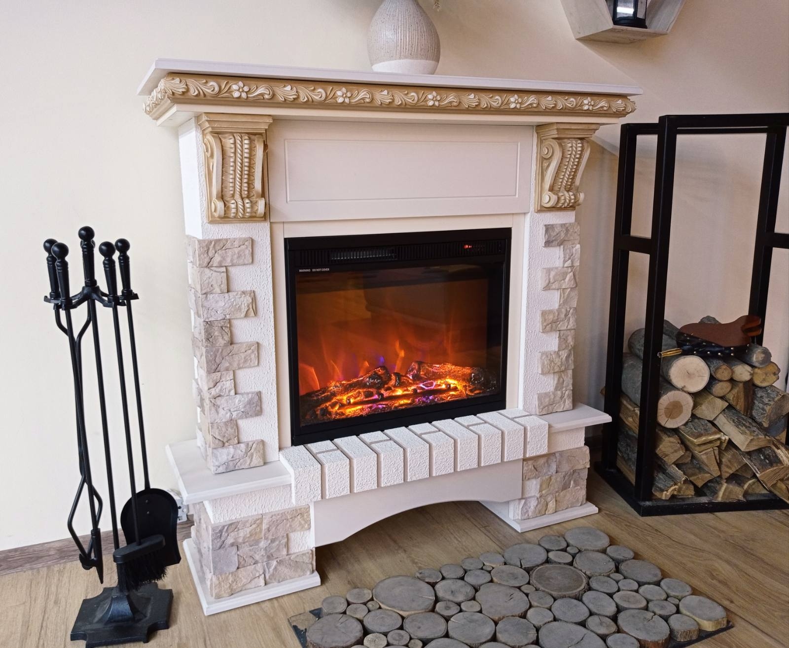 The portal "Topaz" is made in a non-standard design with a small stand that will protect the hearth from external factors. On the front side of the product are decorative ornaments and stones. The product is made of high quality MDF and chipboard materials.